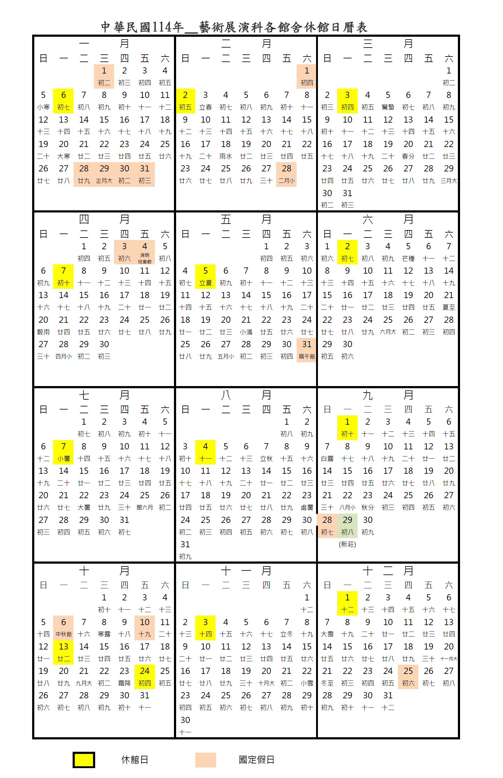 演藝廳/演奏廳 每場演出前60分鐘開放驗票進入大廳,演出前30分鐘開放觀眾席入內就座;實際情形將依節目主辦單位準備狀態酌予調整。 休館時間:政府公告之天然災害將停止上班。